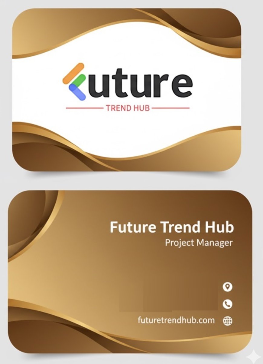 Create a modern and professional business visiting card design in a horizontal layout with rounded corners. Use a luxury theme with golden, brown, and beige gradient backgrounds, inspired by elegant corporate card designs. The left side should feature the attached Future Trend Hub attached logo prominently, while the right side should include the following details in a clean and stylish font: